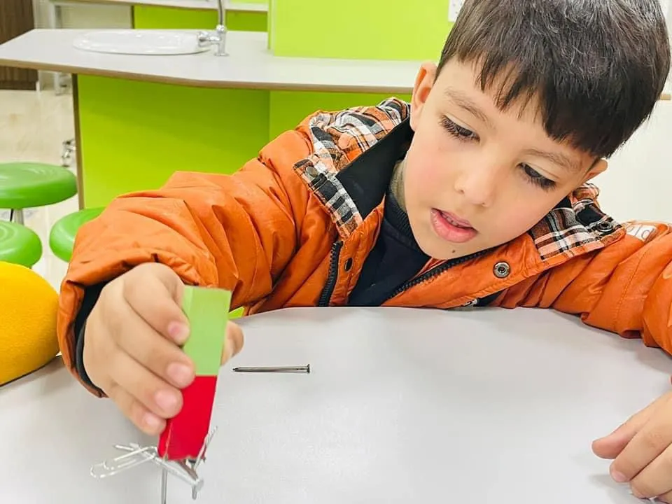 لاحظ وابحث وتفكر ... وتساءل واسمع وانظر فكك أشياء وركبها ..بجو مليء بالمرح والتّعلّم، تعلم أطفال الرّوضة مفهوم المغناطيس والمواد التي يجذبها والتي لا يجذبها ومفهوم يجذب ويتنافر وأشكال المغناطيس كلّ ذلك بالتّجربة والتّطبيق العمليّ في مختبر العلوم